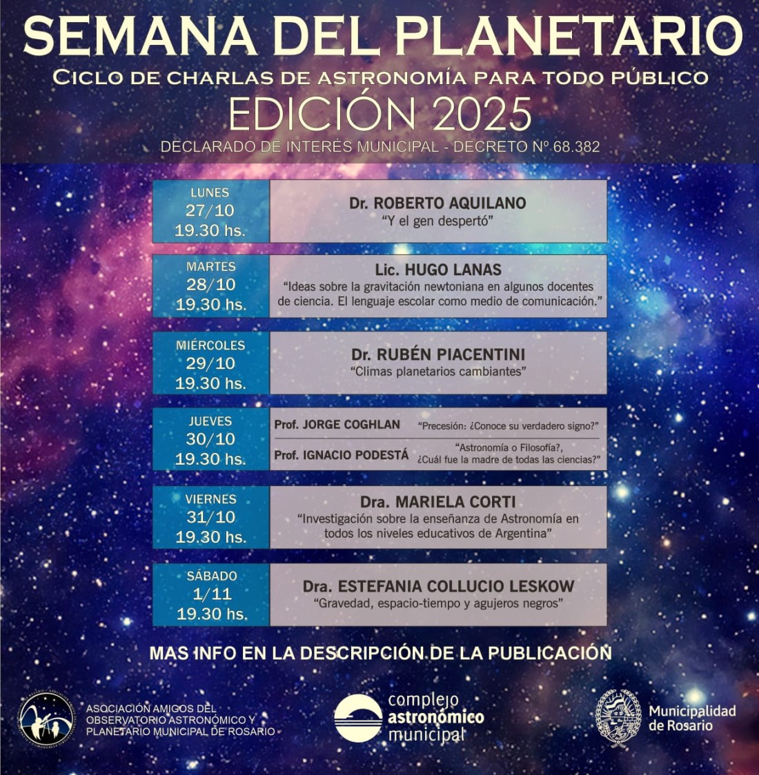 La Asociación Amigos del Observatorio Astronómico y Planetario de Rosario, junto al Complejo Astronómico Municipal, invitan a una nueva edición de la Semana del Planetario: seis días dedicados a la exploración del cosmos, el pensamiento científico y la divulgación de la astronomía.